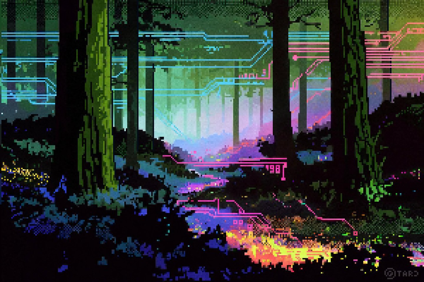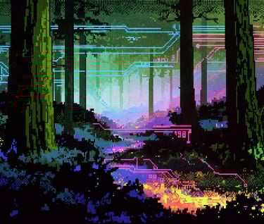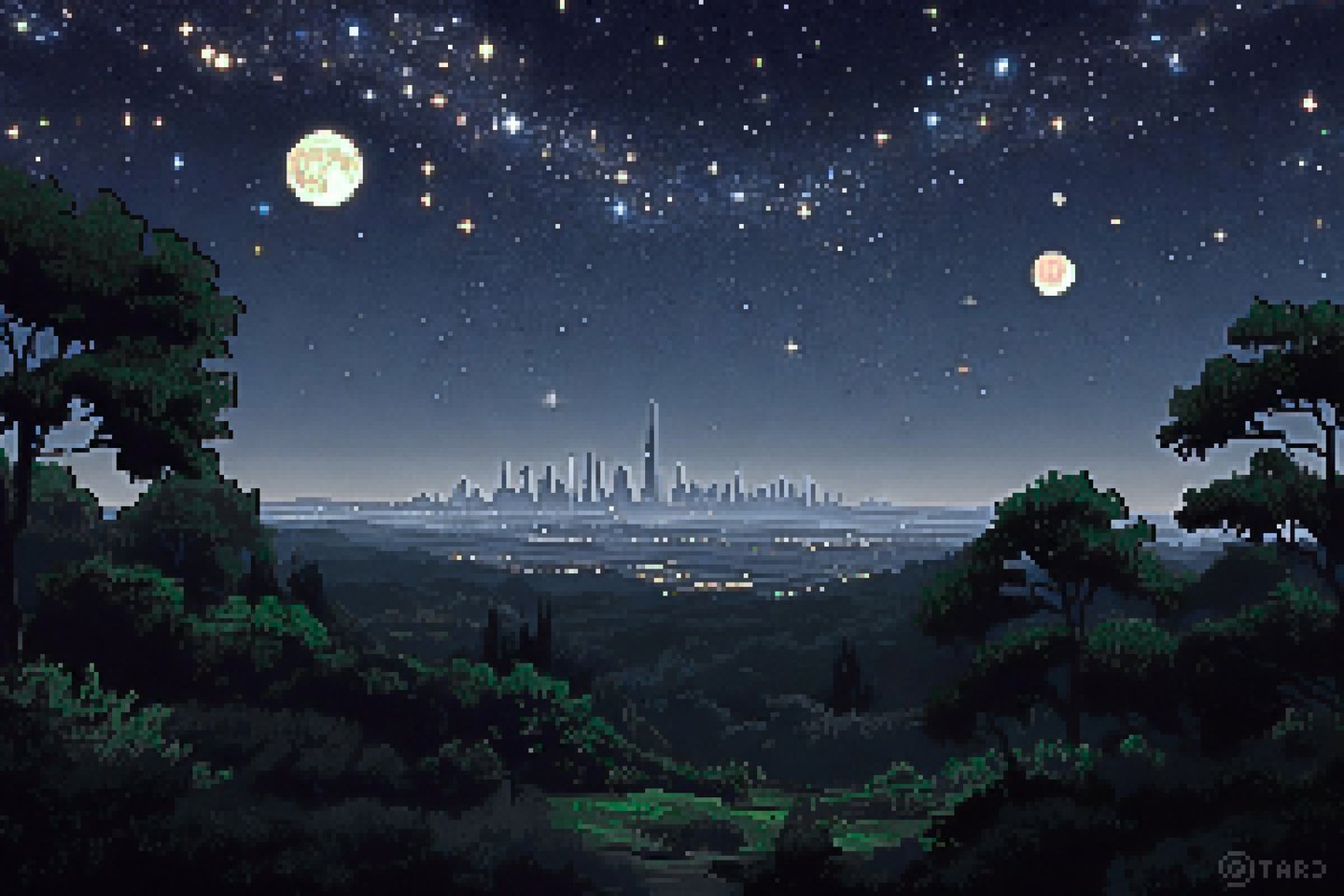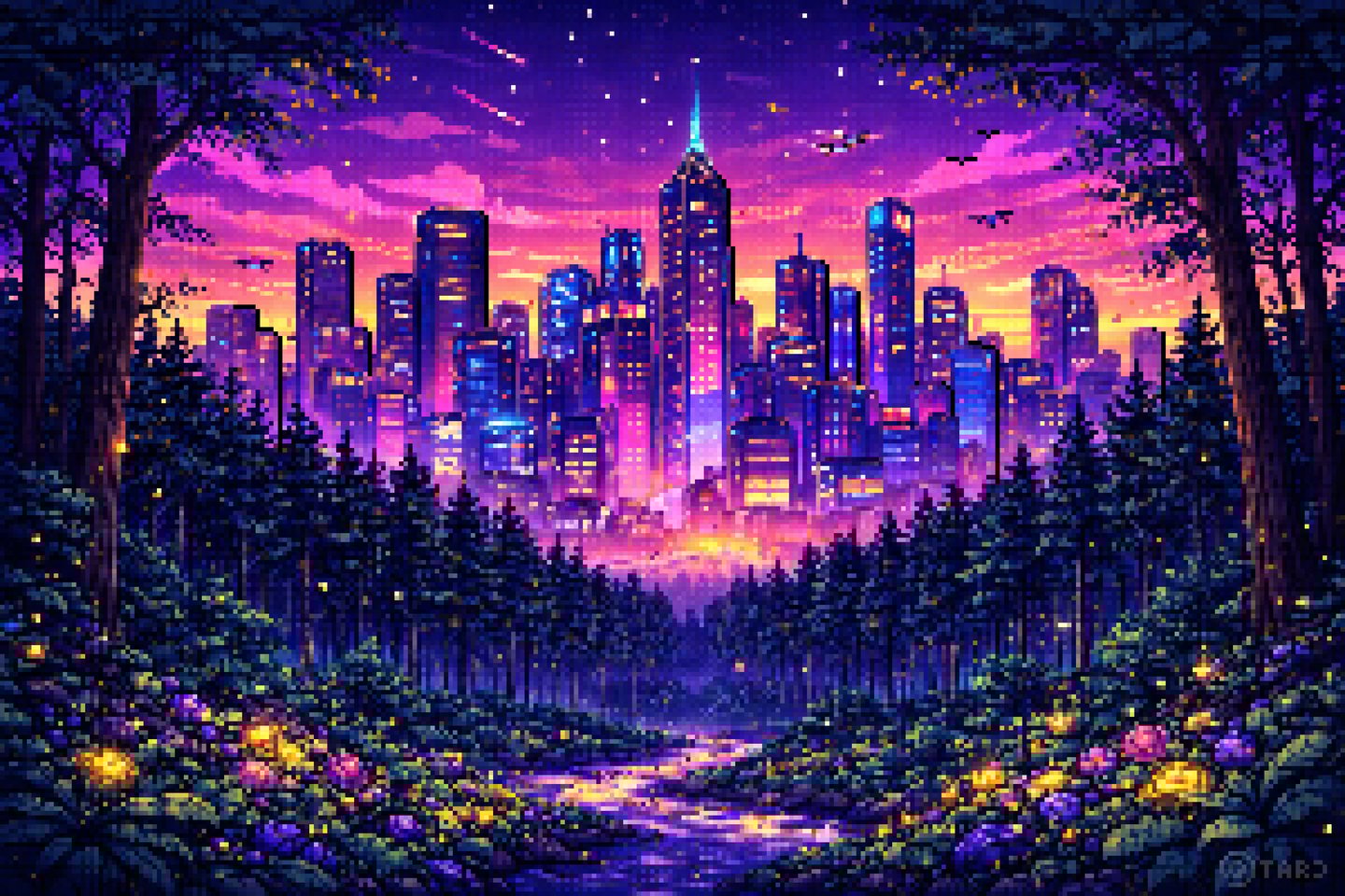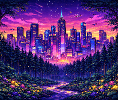 This was one of the first artworks I considered professional before I started taking it seriously. It began with a couple of buildings and eventually evolved into, as you can see, a sort of cyberpunk city surrounded by a forest.